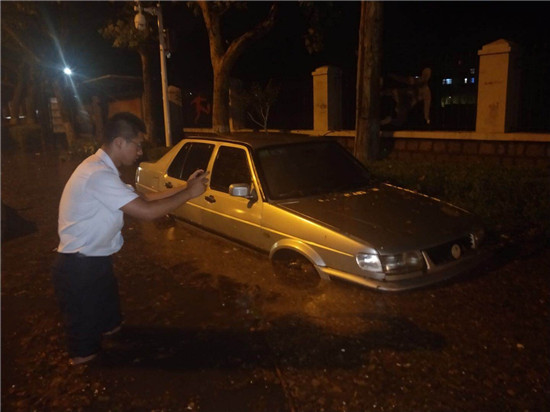 图为查勘员在没膝的雨水中为涉水车辆定损