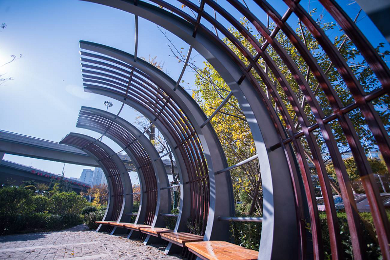 公园改建前利用简易的街角绿地,拆除违章建筑后的空地及乱停车区域,按照地形及周边环境,因地制宜的栽植花卉、观赏草和造型各异的景观植物,借助现状设施增设座凳和廊架等方便实用的“城市家居”;在设计伊始融入各类文化因素使市民在小憩的同时可以浏览阅读,增强文化和学术氛围,增加乐趣的同时提升素养;同时选用大乔木营造林荫空间,设置庭院灯,打造具有文化氛围的供人群休息、穿行、集散的道路节点空间。