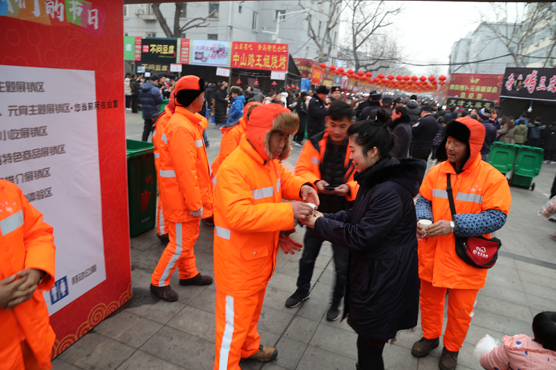 寒风中飞舞着雪花,挡不住民众闹元宵、品糖球的热情。2019年青岛糖球会上商户林立,游客比肩接踵,争相品尝诸多点心小吃,安保人员与环卫工人长时间在露天环境下工作,任务繁重,条件艰苦。