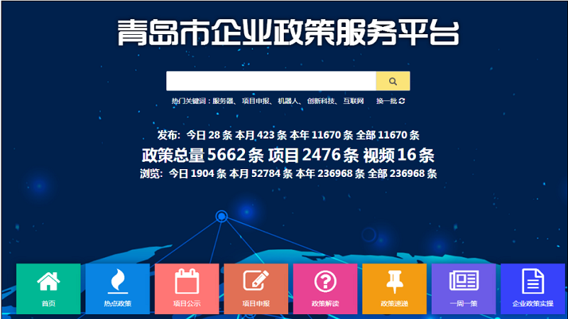 政策服务的基础在信息。“中心”以青岛市中小企业云服务平台(http://www.qdmqfw.com/,以下简称“云服务平台”)为依托,搭建了集发布、查询、解读等多功能为一体的政策数据库,通过智能爬取、人工甄选,以企业需求为纲,打破信息藩篱,跨层级、跨部门搜集、发布各类政策信息7000余条,实现政策信息全面覆盖。并对政策主题、发文时间、申报时间进行多维度提炼、归纳,方便企业检索查阅。此数据库亦是前台服务随时可提取的“弹药库”。