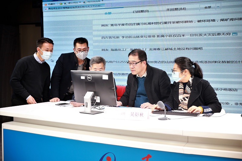 青岛市生态环境局副巡视员吴衍秋(一排左一)与网民在线交流 (摄影宁冠宇)