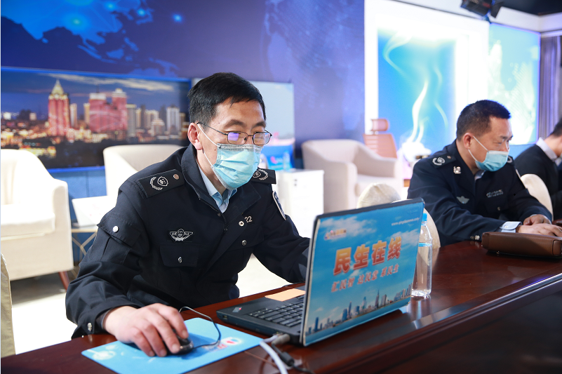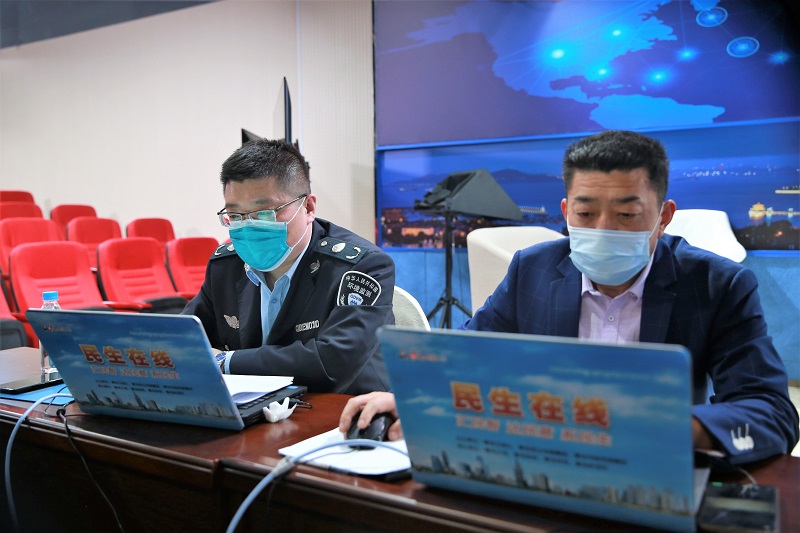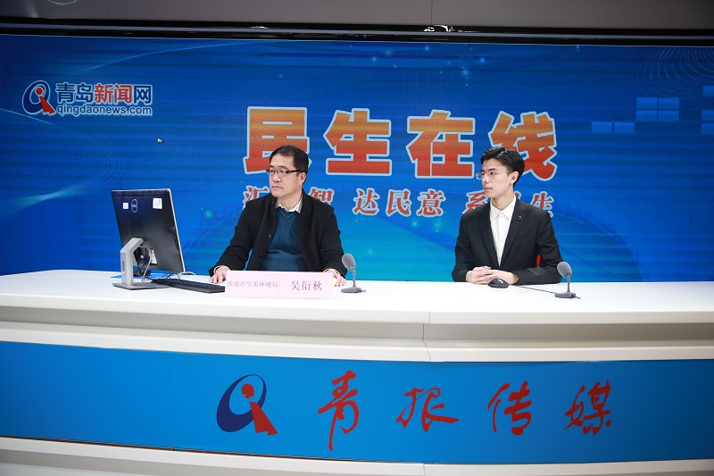 青岛市生态环境局副巡视员吴衍秋(一排左一)与网民在线交流 (摄影宁冠宇)