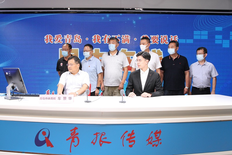 青岛市体育局党组书记、局长、市体育总会主席车景华(一排左一)与网民在线交流