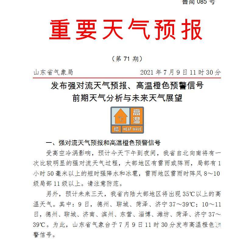 本周末,我省将开启“闷蒸”模式。根据国家预警信息发布中心消息,预计未来三天,我省内陆大部地区将出现35℃以上的高温天气。其中:9日,德州、聊城、菏泽、济宁37~39℃;10日到11日,德州、聊城、济南、滨州、东营、淄博、潍坊、菏泽、济宁37~39℃。为此,山东省气象台于7月9日11时00分发布高温橙色预警信号。