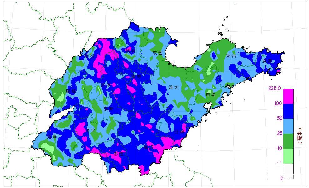 6月28日20时至7月9日8时,全省平均降水量50.4毫米,折合水量约79.1亿方,雨量分布不均(图1)。各市平均(毫米):枣庄78.4临沂78.4淄博76.5日照69.6济南64.2威海58.7德州58.4济宁54.5滨州50.4泰安43.9菏泽36.7聊城35.6潍坊33.7东营31.5烟台30.2青岛27.8。排在前5位的是:济宁鱼台老砦235.0德州临邑临南190.7德州乐陵丁坞186.6德州临邑德平177.0济宁嘉祥万张175.9。1小时最大降雨量89.8毫米,6月29日6时出现在济南商河韩庙站。24小时最大降雨量211.5毫米,6月29日出现在济宁鱼台老砦站。