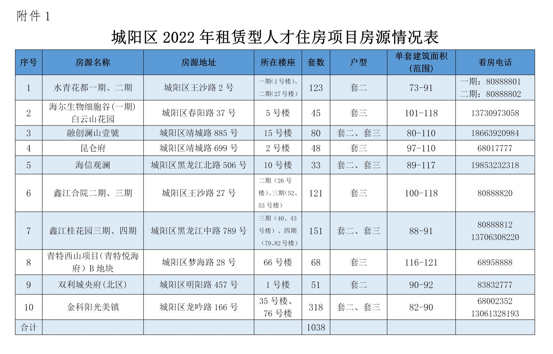 本次日常配租房源共包含水青花都、昆仑府等10个租赁型人才住房项目,房源共计1038套,具体房源位置、套数、户型等信息见附件1《城阳区2022年租赁型人才住房项目房源情况表》。