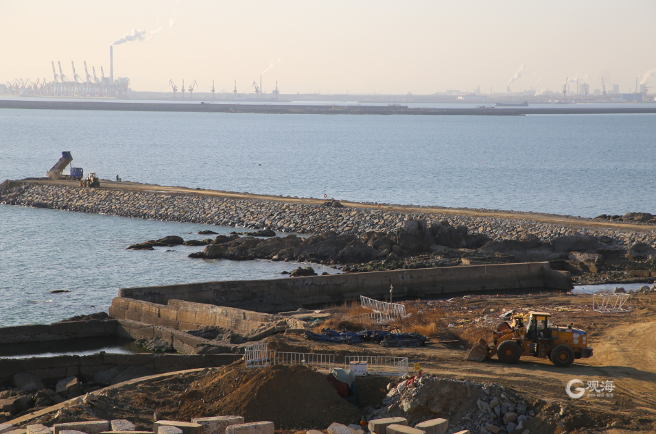 董家口港区胡家山防波堤项目由中交一航局二公司青岛项目部承建,属于我市重点港口基础设施建设项目。其中,东防波堤线形为直线,长1343米,接岸点为胡家山前咀突出部,接岸段长544.5米,为斜坡堤的形式;直立段长度798.5米,为沉箱结构。外海侧抛石理坡已完成300米,堤身抛填已完成330米。