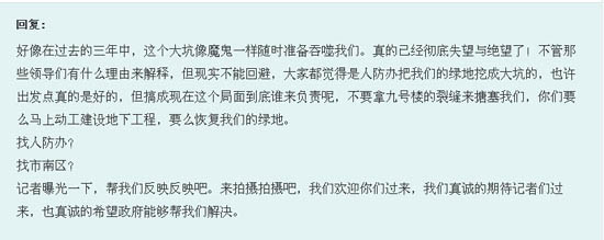楼梯裂缝,居民长期担惊受怕 青岛新闻网8月6日讯 挖坑3年却没有后续建设,曾经的休闲广场变成蚊蝇荒草滋生之地,工程爆破导致楼体裂缝……近日,一个《湛山广场挖坑3年仍荒废 怀念曾经的美丽 谁来拯救?(图)》的帖子在青青岛社区引发热议。 “这么久了还是一点动静都没有,好好的绿地没有了,只留下这个大坑一放就是几年,谁负责?谁给解决?”网民在发帖中纷纷表达对烂尾工程的不满。8月6日,青岛新闻网民生在线记者到现场对此问题进行了采访,周边居民说,希望政府有关部门能够尽快还居民一个安全的生活环境。 记者来到湛山小区九号楼三单元,居民向记者反映说,由于项目施工的原因,附近居民楼出现不同程度的墙体裂缝,危及居民的生命和财产安全。据反映,湛山广场改造计划也正是由于施工中对周围小区的楼体造成了破坏,工程被迫停止。 “从施工开始,房屋就出现了裂纹,并且裂纹越来越大。”家住三单元的赵女士接受采访时说,自己也是从那时患上的病,晚上不能睡得安稳。原本居民都以为湛山广场规划是一个好事,附近居民忍受了施工带来的噪音和粉尘等问题,可万万没有想到,施工过程中对房屋的影响那么大,更没想到,工程会拖到现在没有一个解决的办法。 社区居民在接受采访 同住三单元的王女士对记者说,自从工程动工,老人就没有了休闲场所,孩子也无处玩耍,并且大坑周围相当危险。前几天大雨,全家都搬出去住了,因为屋内有明显的漏雨。由于当初施工破坏了九号楼的地基,所以导致裂缝越来越大。 记者采访中,现场的居民纷纷表示:以前湛山广场是附近居民休闲娱乐的好去处,可现在由于施工一直不能进行,不仅影响了附近居民的休闲生活,也对居民的出行造成了很大的困扰,并留下了很多安全隐患。 小区居民纷纷表示,已经数次向有关单位反映情况,可问题迟迟不能得到解决,工程一拖就是三年多。至今相关部门也没能拿出一个可行的解决方案。 今年6月19日,市人防办副主任刘崇进做客民生在线,就湛山广场改造问题回答网友提问时表示,湛山广场人防工程是经国家人防办批准立项的平战结合人防工程。该项目建设过程中由于建设单位和澳华公司的原因造成了安全隐患,致使基坑开挖后长期无法进行后续建设。市政府和市南区政府已经多次召开专题会议进行研究解决。据了解,市南区政府已组成专门工作组具体负责此项工作。目前建设单位和投资单位正在与居民协商确定翻建方案,达成协议并报相关部门批准后,即可恢复施工。 本网将继续关注此事。(青岛新闻网 民生在线记者) 网友发帖曝光湛山广场大坑问题 相关链接: