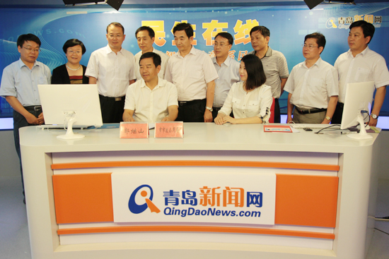 青岛市市政公用局党委书记、局长郭继山(一排左一)与网民在线交流 (周琦 摄影)