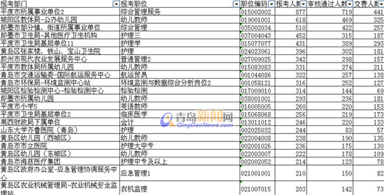 83个职位报名人数突破100人。排名前十位的职位报名人数均超过300人,分别是:平度市所属事业单位2综合管理服务,877人;城阳区教体局公办幼儿园幼儿教师,618人;即墨市部分镇、街道所属事业单位综合管理,510人;即墨市卫生局其他医疗卫生机构护理三,452人;平度市卫生局基层单位11护理学,431人;黄岛区张家楼、铁山、宝山卫生院护理,396人;胶州市现代农业发展服务中心普通管理2,342人;平度市教体局所属幼儿园幼儿教师,331人;青岛市交通运输委国际航运服务中心,322人;青岛市环保局环境检测中心站环境检测与数据综合分析岗位2,316人。