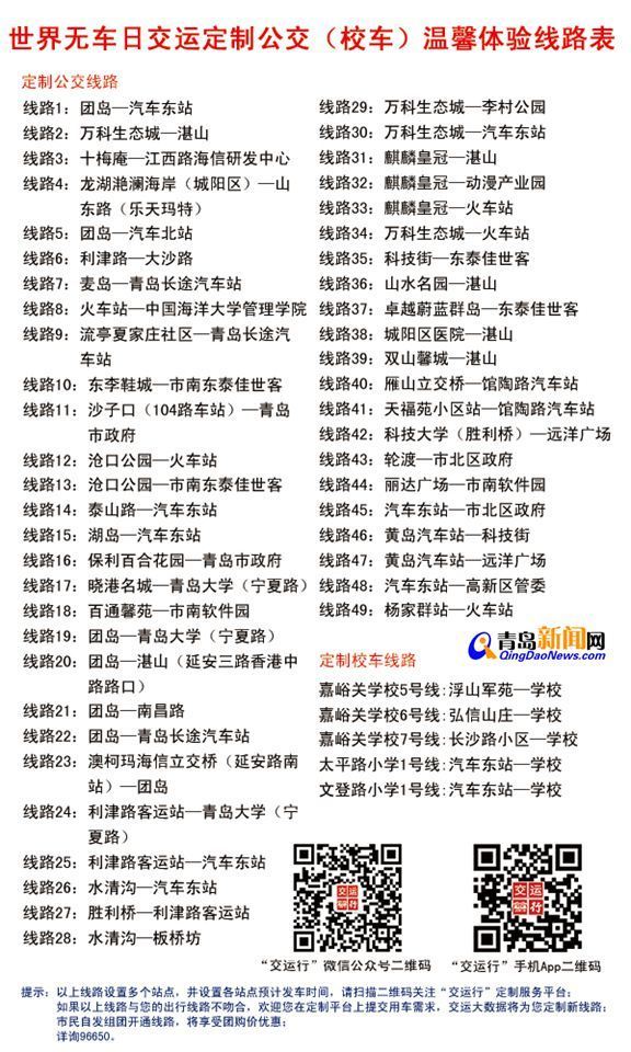 青岛新闻网9月21日讯 明天是世界无车日,青岛新闻网从交运集团(青岛)获悉,为倡导市民放下私家车、乘坐公共交通工具出行,交运集团“交运行”定制服务平台推出“世界无车日交运定制公交(校车)温馨体验”活动,根据市民提交的出行需求,运用交运大数据分析汇总,推出49条定制公交“交运巴士”线路和5条定制校车线路。市民关注“交运行”微信公众号或下载“交运行”手机App后,只需支付一元即可体验定制公交“交运巴士”及定制校车服务。