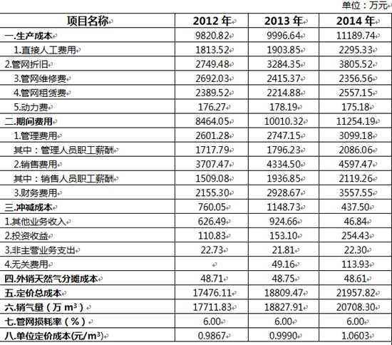 泰能天然气有限公司2012年至2014年管道天然气输配定价成本核定表