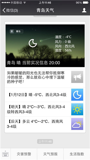 针对网友提出的充分利用新媒体开展气象服务的建议,市气象局认真调研,开发了“青岛气象”手机客户端,融入本地特色,包括天气实况、短时、短期预报、未来7天预报、气象预警、青岛气候介绍、旅游气象、海洋预报及交通气象等功能模块,目前已基本达到上线要求。“青岛天气”微信公众号发布渠道与国突系统对接实现信息统一发布。11月份,完成了“青岛气象”新浪微博“官方蓝V”用户注册认证。