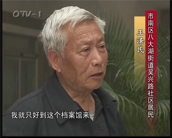 利用者王泽民老先生60年代曾经在集体经济的窑厂工作过4年,苦于无材料证明,无法计算连续工龄,为此,年逾七旬的老人抱着试试看的心情走进档案馆,当工作人员几经周折,查询并帮他理清证明工龄的材料时,老先生感慨的说,我今年77岁了,第一次感动……在2015年7月19日晚青岛电视台黄金时间《我身边的机关人——青岛市档案馆文档服务中心》播出。