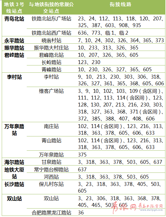 青岛日报/青岛观/青报网讯 地铁3号线南段将于近期开通试运营,为更好地方便市民在地铁3号线和常规公交之间换乘,青岛市运管局在对地铁3号线沿途各站点可换乘的公交线路进行了梳理的基础上,于12月15日发布了《地铁3号线与常规公交换乘指南》,市民可根据各自出行目的地,选择合适的站点换乘出行。