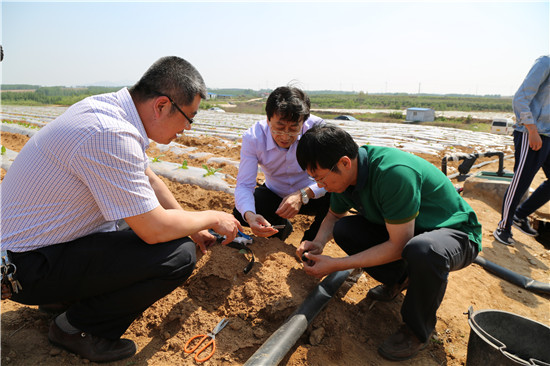 青岛市烟草专卖局(公司)党委委员、副总经理韩庆斌(图中)带队到黄岛区帮助烟农安装烟叶滴灌设施