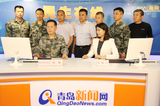青岛市征兵领导小组副组长、青岛警备区副司令员郇敏(一排左一)与网友交流 (摄影 周琦)