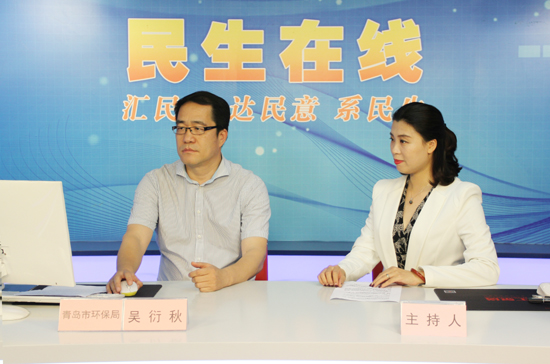 青岛市环境保护局副巡视员吴衍秋(左一)与网友交流 (摄影 周琦)