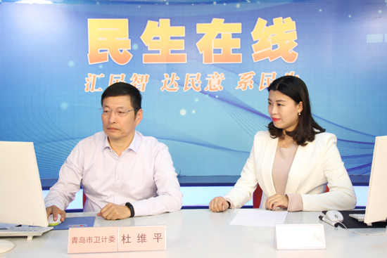 青岛市卫生和计划生育委员会党委委员、副主任杜维平(左一)与网友交流 (摄影 周琦)