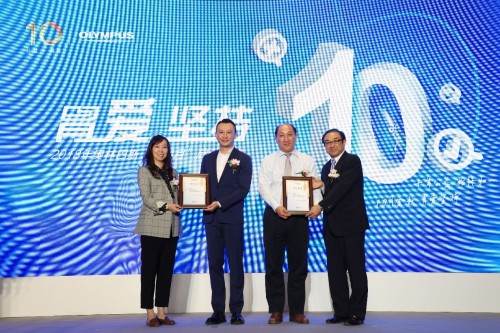 在调研报告公布后,隐岐浩史先生、丁莹女士向亲临现场的王贵齐教授、曹涤非先生授予“爱胃大使”称号,并一同拉开了2018奥林巴斯“爱胃月”的活动帷幕。