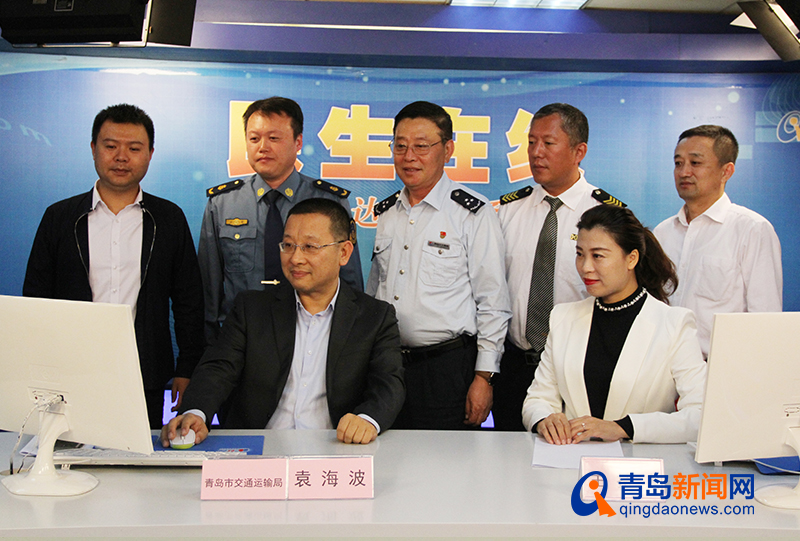青岛市交通运输局党组成员、市道路运输管理局局长袁海波(一排左一)与网友交流 (摄影荆潇坤)
