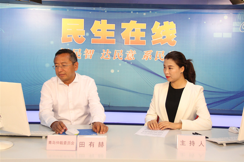 青岛仲裁委员会办公室副主任田有赫(左一)做客网谈直播室 (摄影 荆潇坤 )
