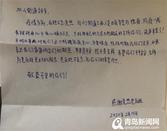 好在被他们护在身后的居民们都知道他们的辛苦。19日上午,居民搬来一箱苹果和一箱金桔放在双山街道办公室楼下,工作人员到楼下时,居民已经匆匆离去,只留下了一封信,信中写到,“苹果是平安,橘子是吉祥,希望你们平安、吉祥,为老百姓带来更好的服务,百姓不会忘记你们的辛苦付出!”