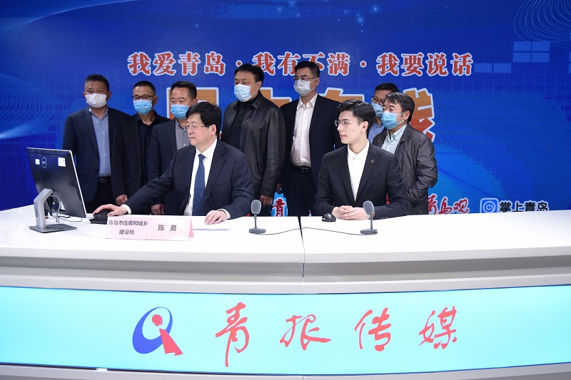 青岛市住房和城乡建设局党组书记、局长陈勇(一排左一)与网民在线交流 (摄影 陈通)
