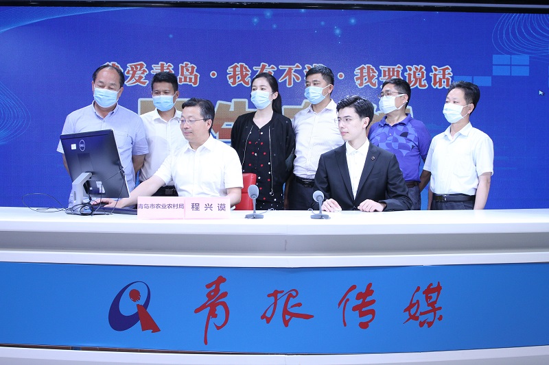 青岛市农业农村局副局级领导干部、市农业机械服务中心主任程兴谟(一排左一)与网民在线交流 (摄影 徐斌 )