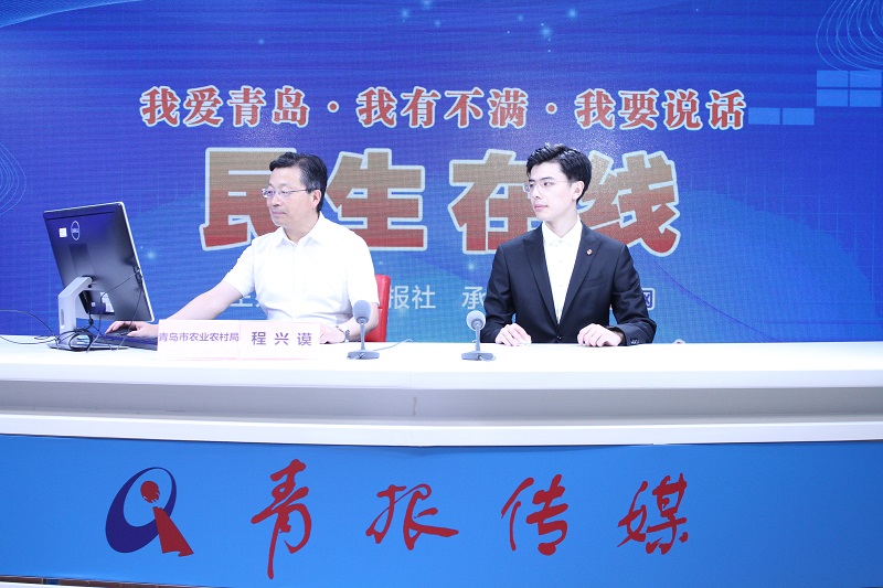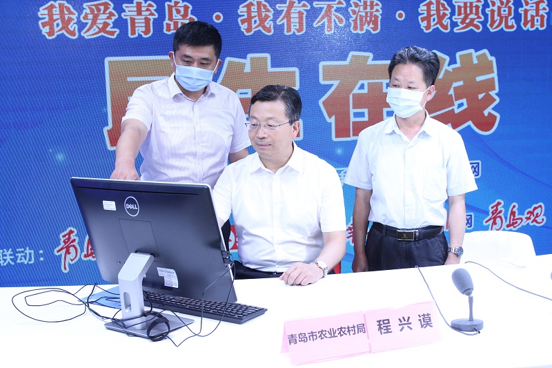 青岛市农业农村局副局级领导干部、市农业机械服务中心主任程兴谟(中)与网民在线交流 (摄影 徐斌 )