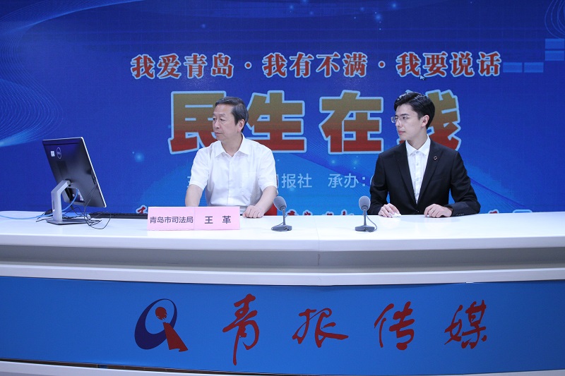 青岛市司法局党委副书记王革(左一)与网民在线交流 (摄影 宁冠宇)