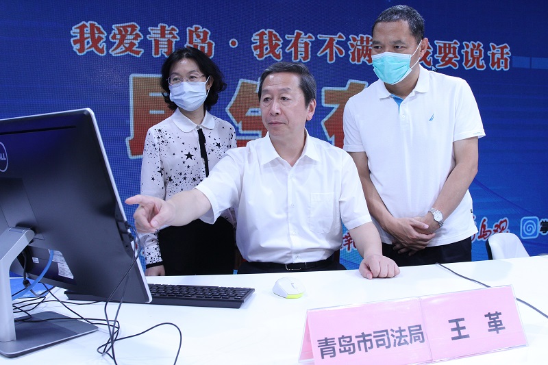 青岛市司法局党委副书记王革(中)与网民在线交流 (摄影 宁冠宇)