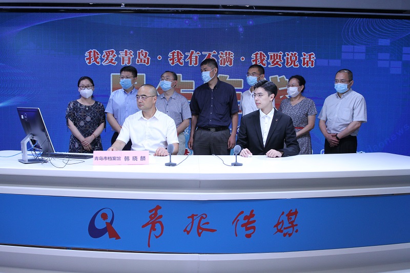 青岛市档案馆副馆长韩晓麟(左一)与网民在线交流 (摄影 宁冠宇)