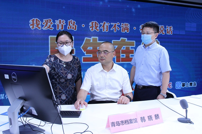 青岛市档案馆副馆长韩晓麟(中)与网民在线交流 (摄影 宁冠宇)