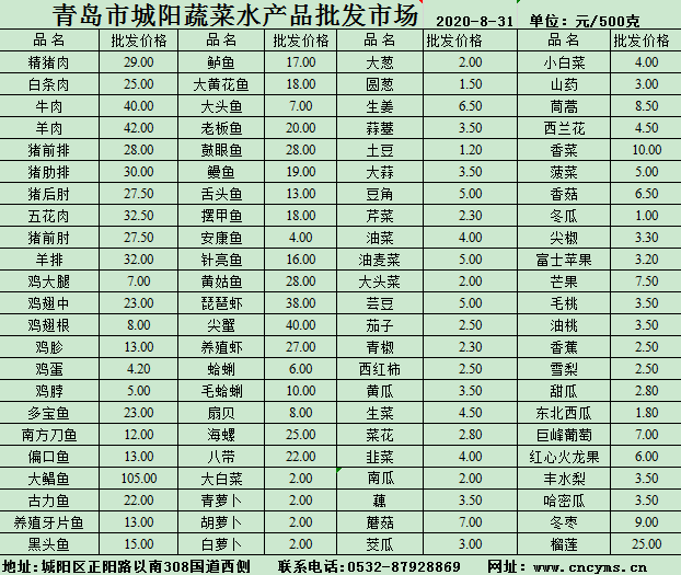 近期青岛市城阳蔬菜水产品批发市场蔬菜上市量小幅上涨,受天气闷热和季节转换影响,蔬菜价格涨多跌少。其中香菜、大葱、苦瓜、芸豆、尖椒、豆角价格小幅上涨。大白菜、刺黄瓜价格小幅下降。目前市场香菜10元/斤、大葱2元/斤、苦瓜4.5元/斤、芸豆5元/斤、尖椒3.3元/斤、豆角5元/斤、大白菜2元/斤、刺黄瓜3元/斤。