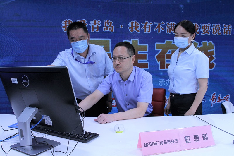 中国建设银行青岛市分行党委委员、副行长管恩新(中)与网民在线交流 (摄影 宁冠宇 )