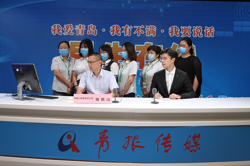 中国人寿保险股份有限公司青岛市分公司副总经理杨铭山(左一)与网民在线交流 (摄影 宁冠宇)