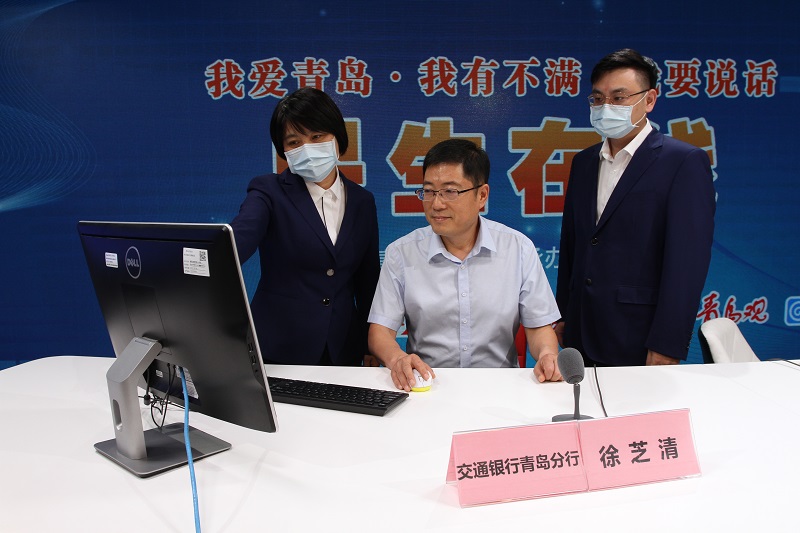 交通银行青岛分行党委委员、副行长徐芝清(中)与网民在线交流 (摄影 宁冠宇)