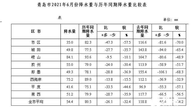 青岛日报社/观海新闻7月2日讯 青岛已经进入汛期,在刚刚过去的6月份,降水情况如何呢?日前市水文局发布6月份雨情、水情和墒情报告,6月全市平均降水量54.4毫米,比历年同期偏少32.4%,比去年同期偏少54.2%,在1952~2021年共70年历史同期降水量系列中,从大到小排第52位,降水偏少。7月1日8时,全市23座大、中型水库蓄水量26493万立方米,较6月1日少1494万立方米,在1960~2021年共62年历史同期蓄水量系列中,从大到小排第17位,蓄水偏多。