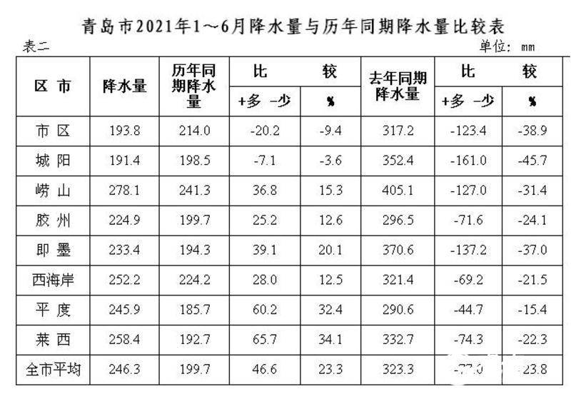 6月上旬降雨较少,部分地区旱情有所发展。6月中旬有一场较大降水,旱情有所减轻。6月下旬降雨次数较多,旱情相对减轻。7月1日8时,全市夏播地平均土壤相对湿度为66.5%,莱西中部和南部出现轻度干旱,其他地区墒情适宜;春播地平均土壤相对湿度为68.9%,即墨南部出现轻度干旱,其他地区墒情适宜。(青岛日报/观海新闻记者 吴帅)