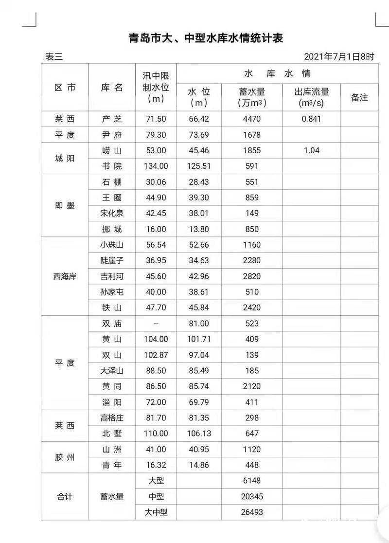 6月份,全市多以局部短历时、低强度降水为主,全市大、中型水库均未进水。7月1日8时,23座大、中型水库水位均在汛中限制水位以下。