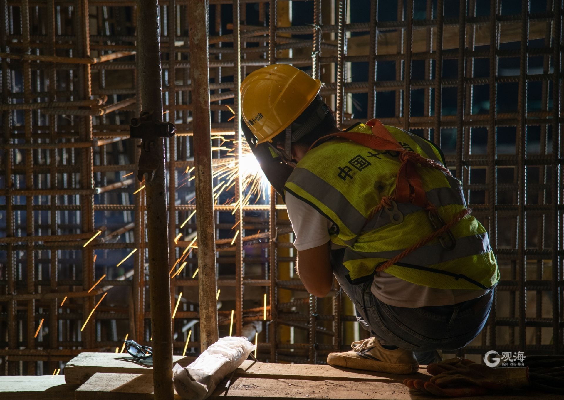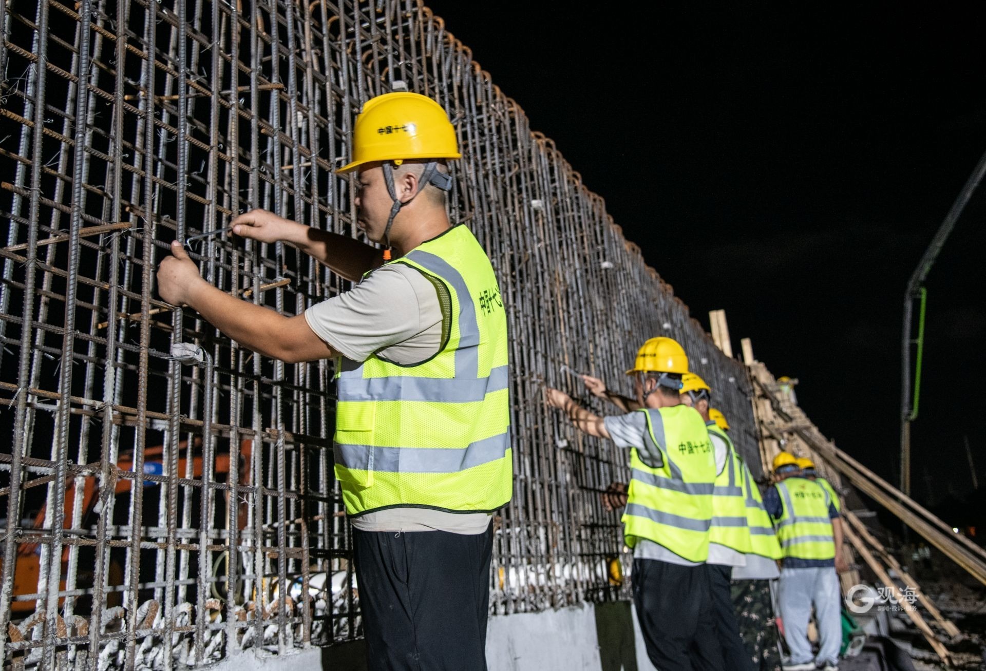夜幕降临,一道道耀眼的焊花肆意飞溅,几名电焊工正站在几米高的钢筋笼上埋头焊接,身后七台挖掘机正在轰鸣声中来回摆臂开挖。而不远处,两台泵车则伸着65米的长臂,混凝土从其中倾泻而下,源源不断地流入钢筋之间……