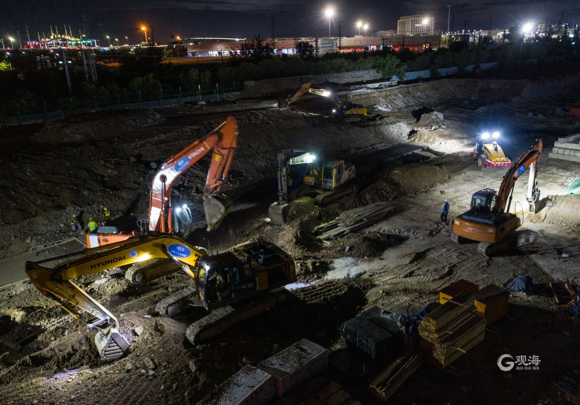 唐河路-安顺路打通工程开启“夜间模式”,呈现出一派热火朝天的繁忙景象。
