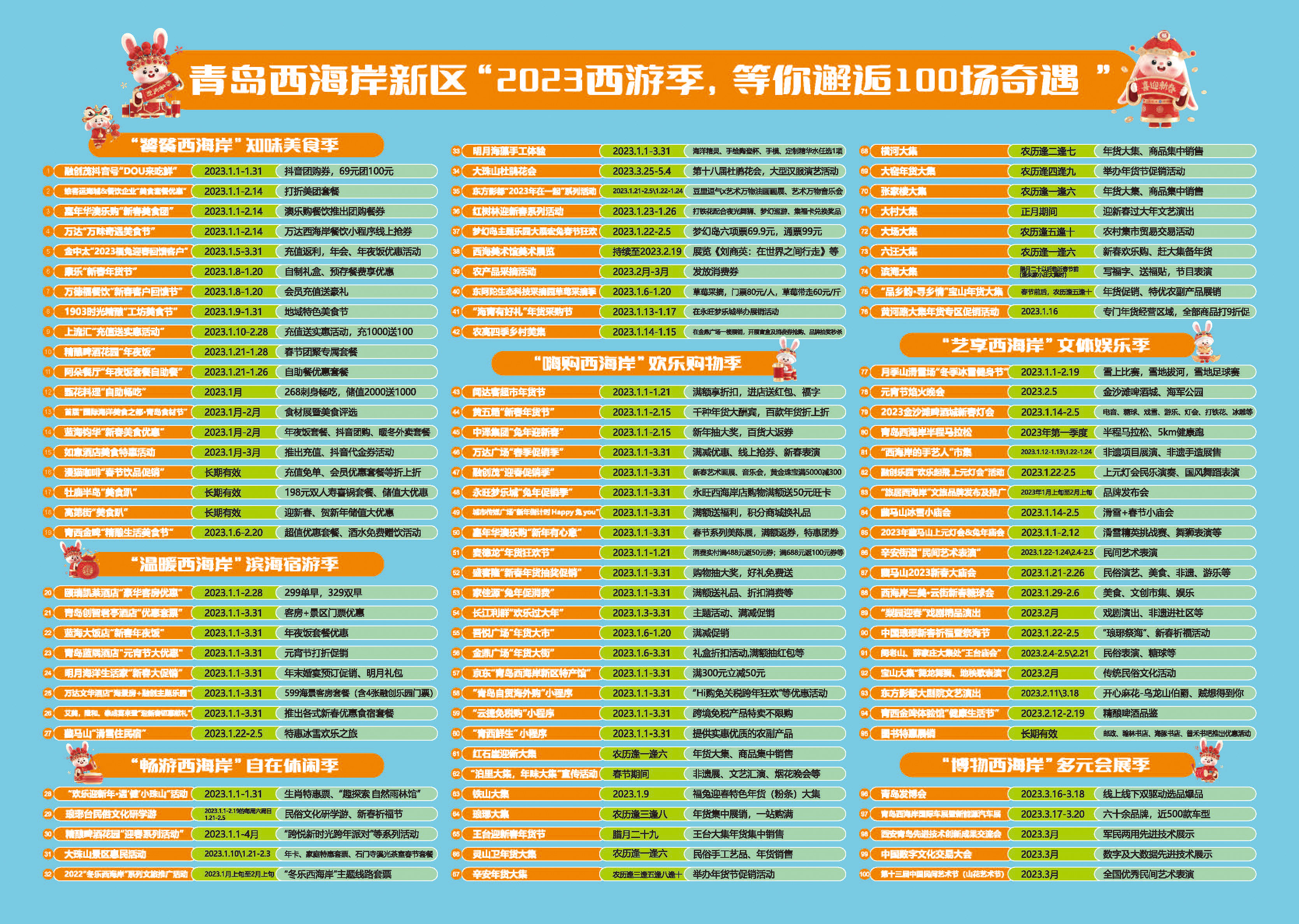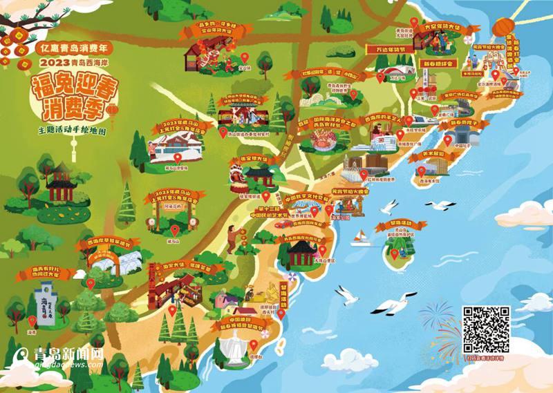 据介绍,六大板块消费季活动精选100场活动,涵盖了吃、住、游、购、娱、展。其中,“饕餮西海岸”知味美食季,餐饮商家推出特色餐饮美食和新春套餐,开展新春美食团、新年美味吃在一起、元宵美食街等活动;“温暖西海岸”滨海宿游季,融创阿朵民宿、艾美酒店等特色民宿、星级酒店,以暖心住宿为核心,推出美食套餐、周边景区、年味体验为特色的一系列新春度假套餐;“畅游西海岸”自在休闲季,推出旅游休闲、新春游园、乡村旅游等丰富多彩的文旅活动;“嗨购西海岸”欢乐购物季,新区各大商超、电商企业和集市为群众提供丰富多样的年货商品;“艺享西海岸”文体娱乐季,推出民俗展演、新春灯会、烟花燃放、庙会、冰雪运动、半程马拉松、游泳健身等群众喜闻乐见的娱乐活动;“博物西海岸”多元会展季,依托青岛世界博览城举办多场精彩会展活动。