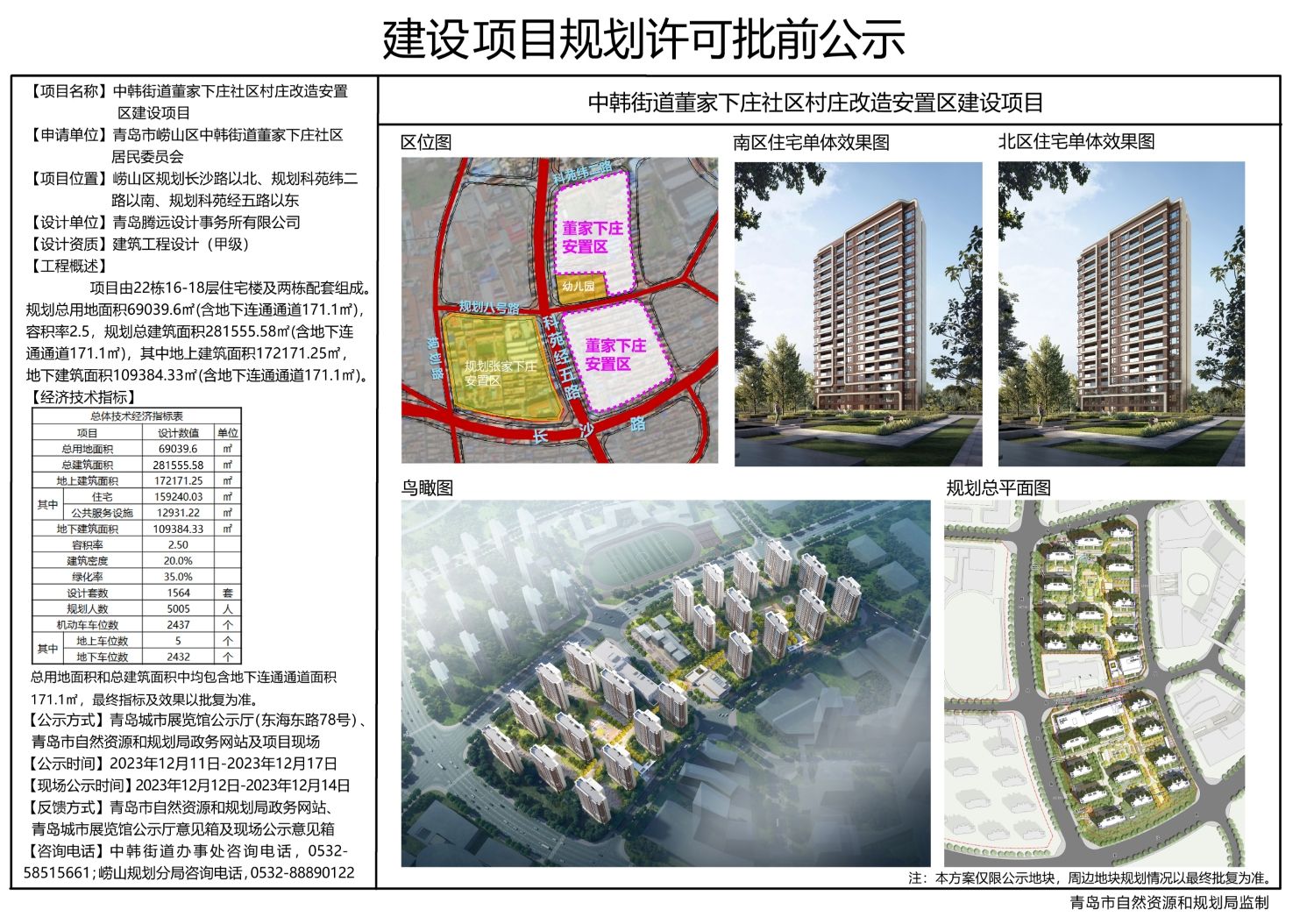中韩街道董家下庄社区村庄改造安置区建设项目位于崂山区规划长沙路以北、规划科苑纬二路以南、规划科苑经五路以东,项目由22栋16-18层住宅楼及两栋配套组成。规划总用地面积69039.6平方米(含地下连通通道171.1平方米),容积率2.5,规划总建筑面积281555.58平方米(含地下连通通道171.1平方米),其中地上建筑面积172171.25平方米,地下建筑面积109384.33平方米(含地下连通通道1711平方米)。项目设计套路1564套,规划人数5005人,规划机动车车位2437个,绝大多数均为地下车位。
