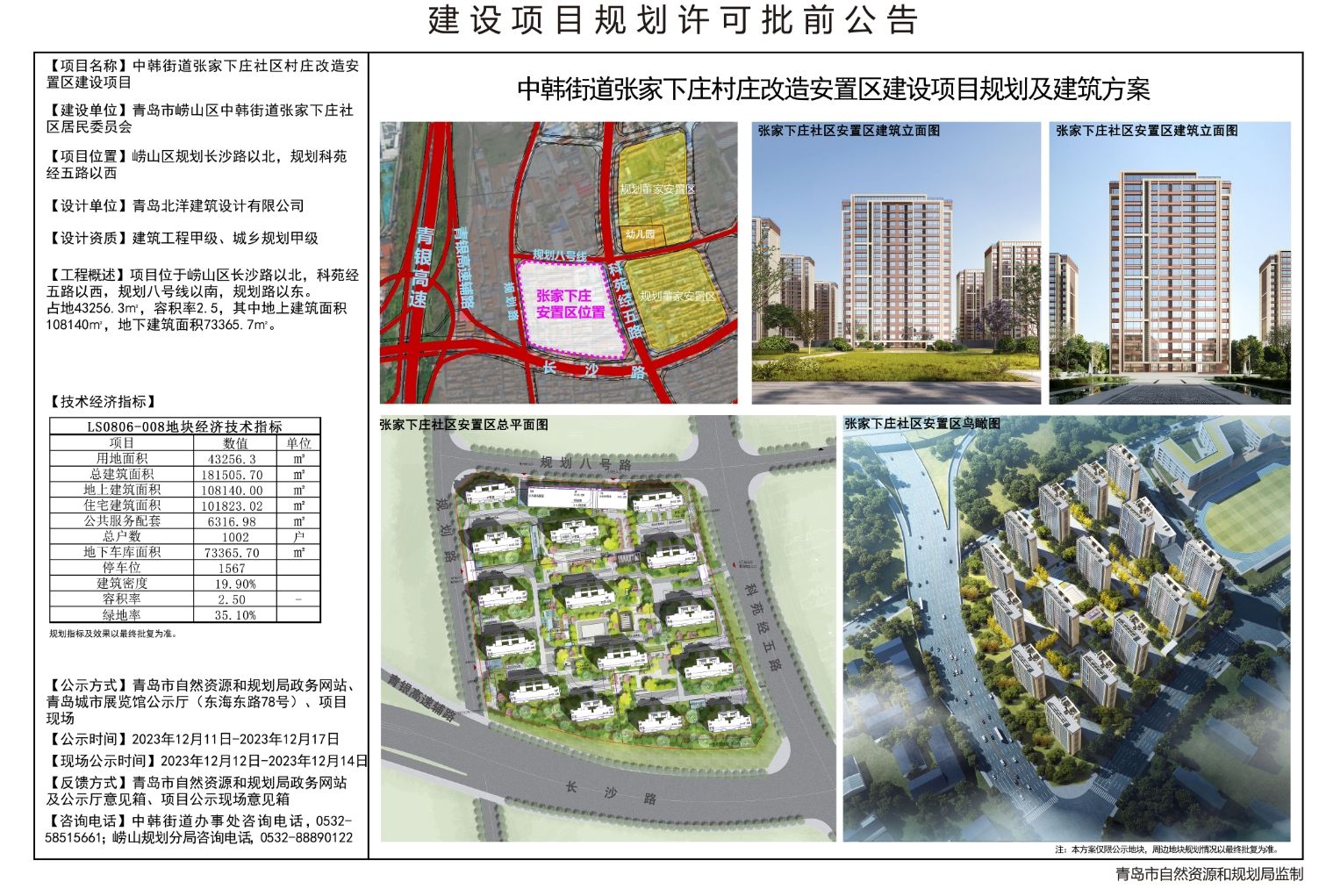 中韩街道张家下庄社区村庄改造安置区建设项目位于崂山区规划长沙路以北,规划科苑经五路以西,占地43256.3平方米,容积率2.5,其中地上建筑面积108140平方米,地下建筑面积73365.7平方米。规划总户数1002户,容积率2.5,绿地率35.1%。(青岛日报/观海新闻记者王冰洁)