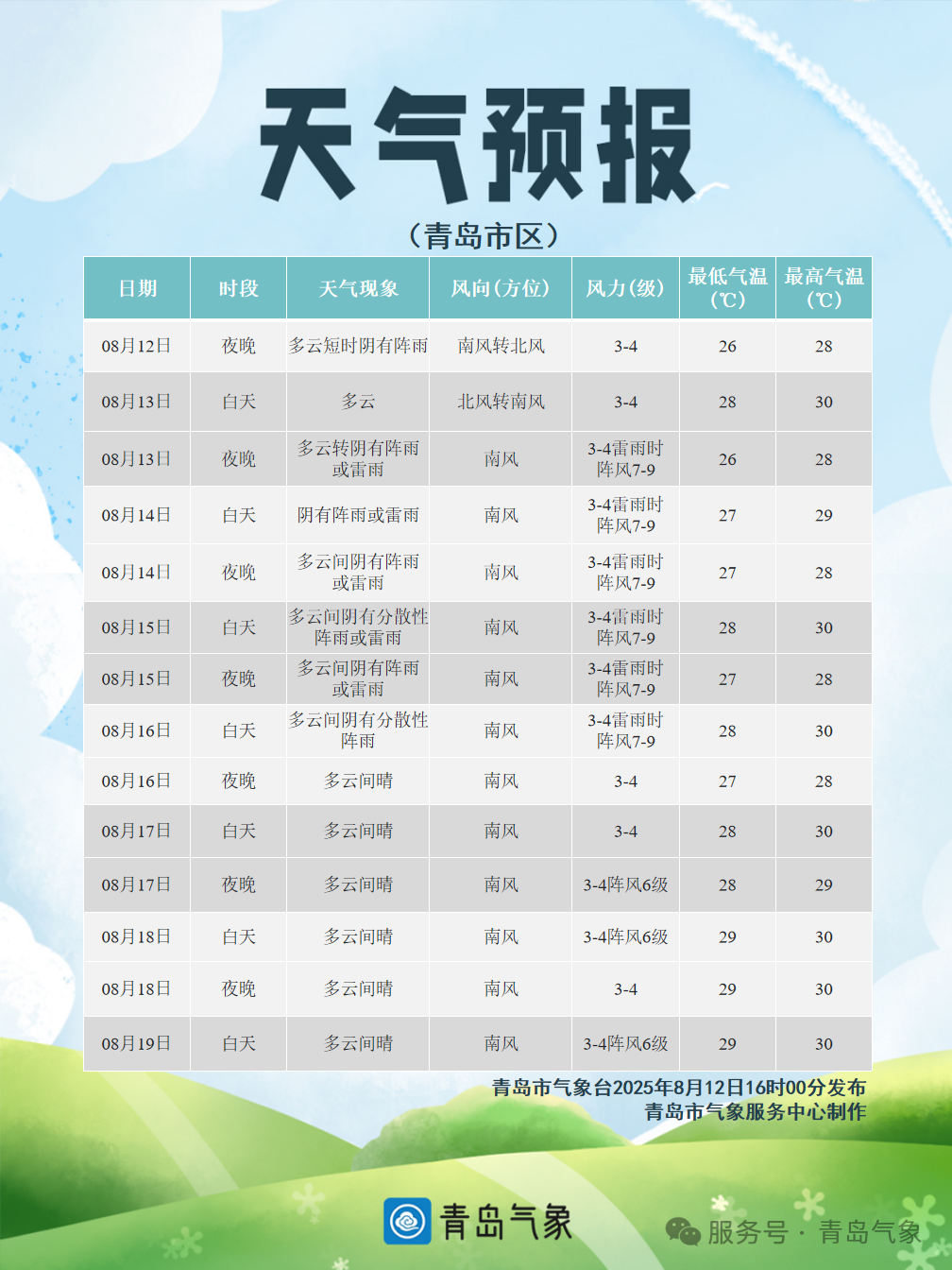 明天白天是个多云天,青岛各区市气温相比今天变化不大,整体较为舒适。全市最高气温在30~32℃之间,适宜出游,白天外出要注意防晒。