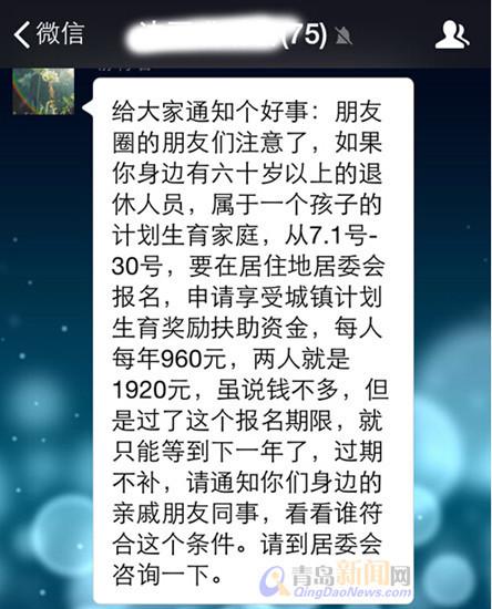 微信朋友圈消息称:“如果你身边有60岁以上退休人员,属于一个孩子的计划生育家庭,从7月1号-30号,要在居住地居委会报名,申请享受城镇计划生育奖励扶助资金,每人每年960元,两人就是1920元。如果错过报名期限,就只能到下一年了,过期不补,详情可以到居委会咨询。”